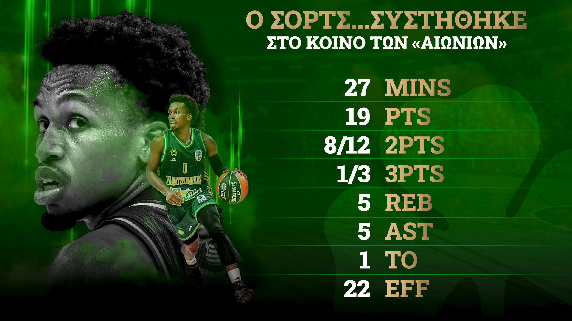 Βέβαια, η απουσία του "Κ" στο ντέρμπι έδωσε την ευκαιρία στον Τι Τζέι Σορτς να πάρει τη μπάλα στα χέρια του, να «τρέξει» την ομάδα και να... λάμψει. Ο Αμερικανός γκαρντ έκανε το καλύτερο παιχνίδι της σύντομης μέχρι στιγμής θητείας του στους επτά φορές πρωταθλητές Ευρώπης, έχοντας 19 πόντους, 5 ριμπάουντ και 5 ασίστ απέναντι στους Πειραιώτες.