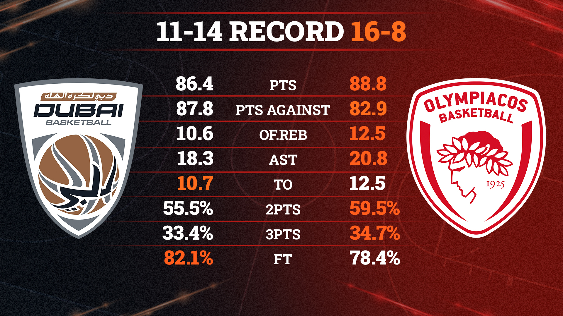 Εκτός έδρας, οι πειραιώτες έχουν επτά νίκες σε δώδεκα αγώνες, ενώ στο παιχνίδι του πρώτου γύρου στο ΣΕΦ, είχαν επικρατήσει σχετικά εύκολα της Ντουμπάι με σκορ 86-67. Ο Γιώργος Μπαρτζώκας και οι παίκτες του, θα πρέπει να ελέγξουν τον ρυθμό μέσα από την άμυνά τους, καθώς οι αντίπαλοι έχουν αρκετό επιθετικό ταλέντο.