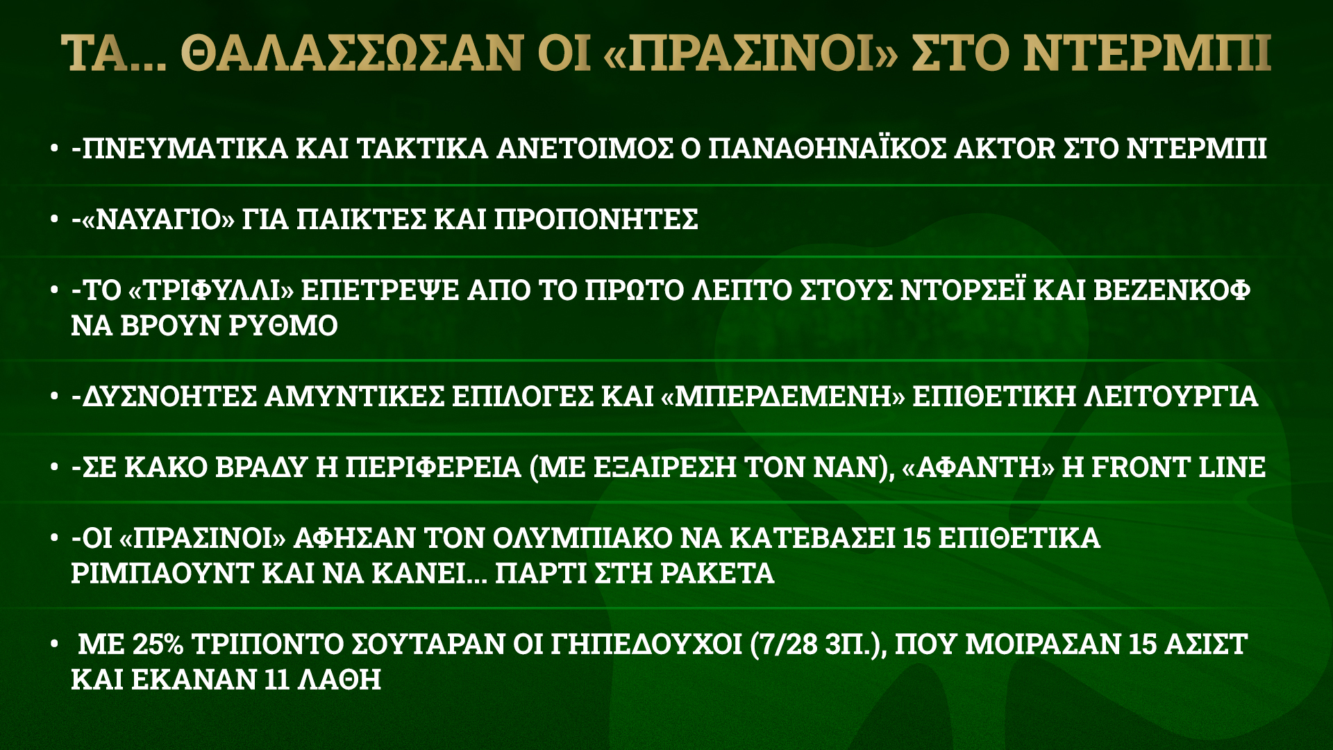 Οι «πράσινοι» πέρασαν κάτω από τον πήχη των προσδοκιών απέναντι στους Πειραιώτες, γνώρισαν την εντός έδρας ήττα στο ντέρμπι και το «ερυθρόλευκο» σερί στην Euroleague διευρύνθηκε σε 10-0. Όπως αναλύθηκε τις προηγούμενες ημέρες, ο Παναθηναϊκός AKTOR παρουσιάστηκε... αγνώριστος στο μεγάλο ματς με την ομάδα του Γιώργου Μπαρτζώκα και «πλήρωσε» ακριβά τα λάθη του.