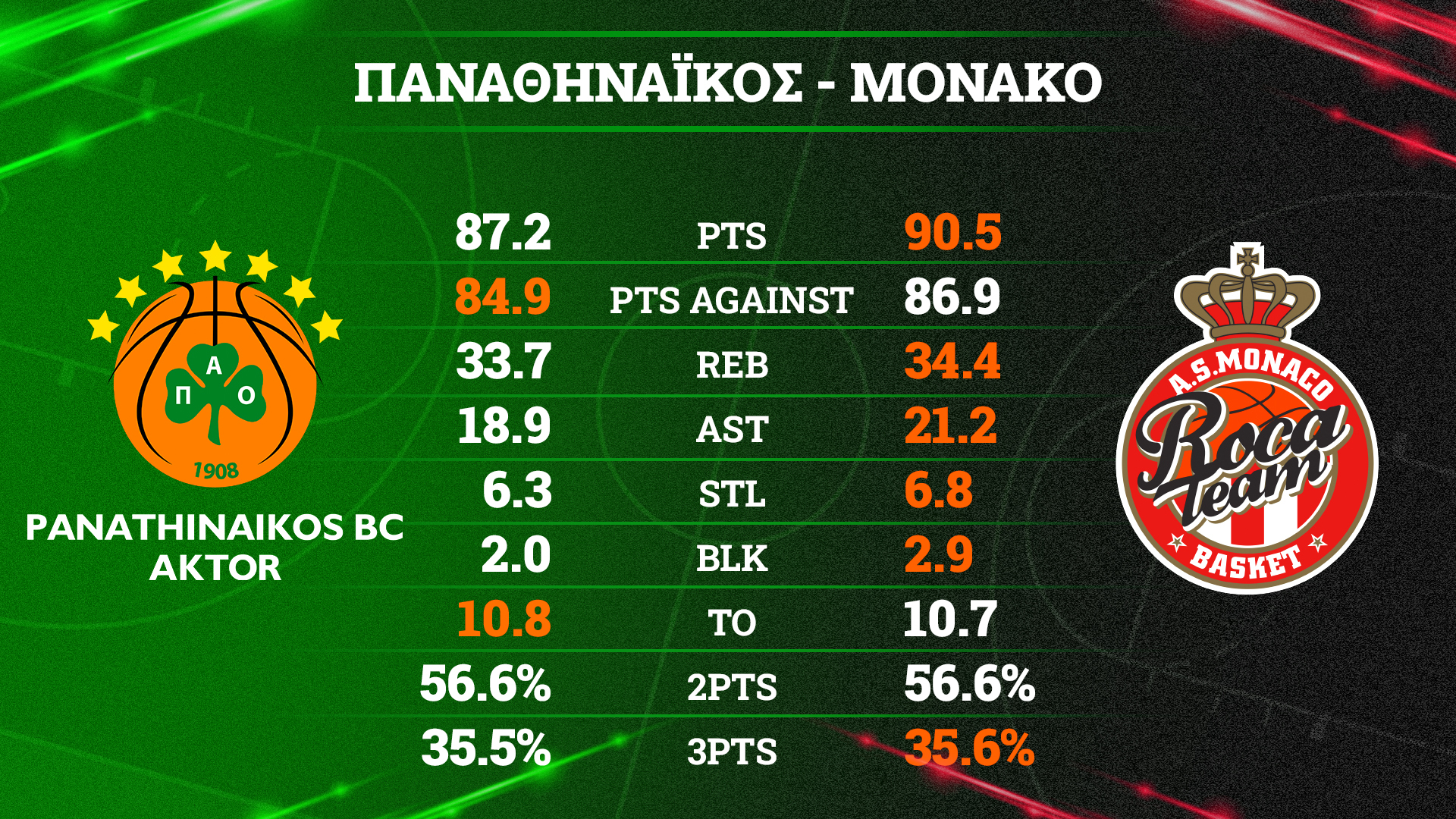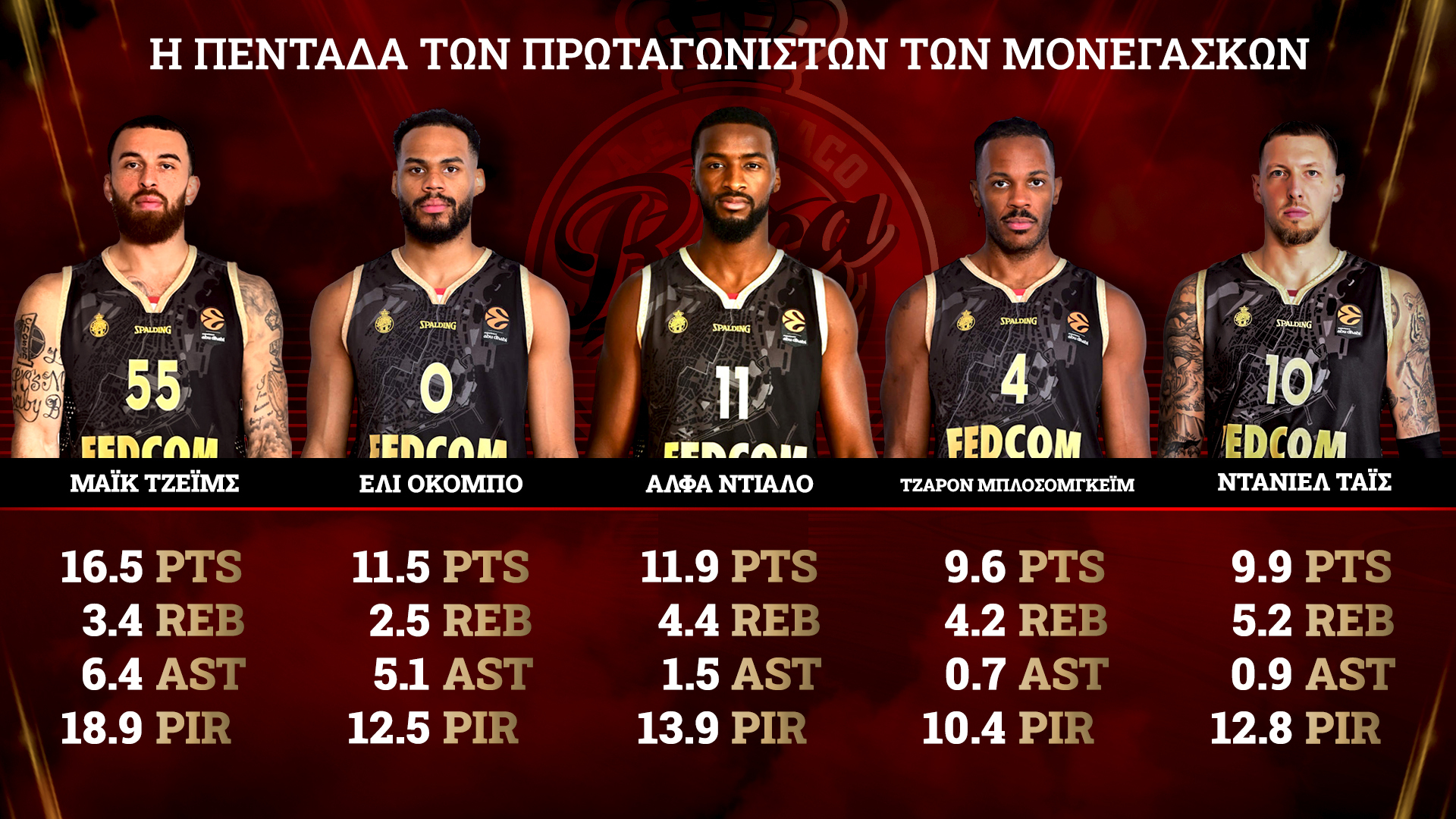 Ο Μάικ Τζέιμς δημιουργεί και εκτελεί με νούμερα που θα μπορούσαν να τον φέρουν στο κατώφλι της 2ης καλύτερης πεντάδας της διοργάνωσης, ενώ ο Έλι Οκόμπο κάνει μια πολύ ώριμη σεζόν. Το δίδυμο Άλφα Ντιαλό και Τζαρόν Μπολόσομγκεϊμ προσφέρει high-level άμυνα, ριμπάουντ και size. Ο Ντάνιελ Τάις αποτελεί «σταθερά» στο ζωγραφιστό. Αυτή η πεντάδα αρκεί για να καταλάβει οποιοσδήποτε ότι ο Παναθηναϊκός AKTOR δεν μπορεί να υποτιμήσει τους Μονεγάσκους και πρέπει να παραταχθεί με την κατάλληλη νοοτροπία και επαρκές... αμυντικό φίλτρο.