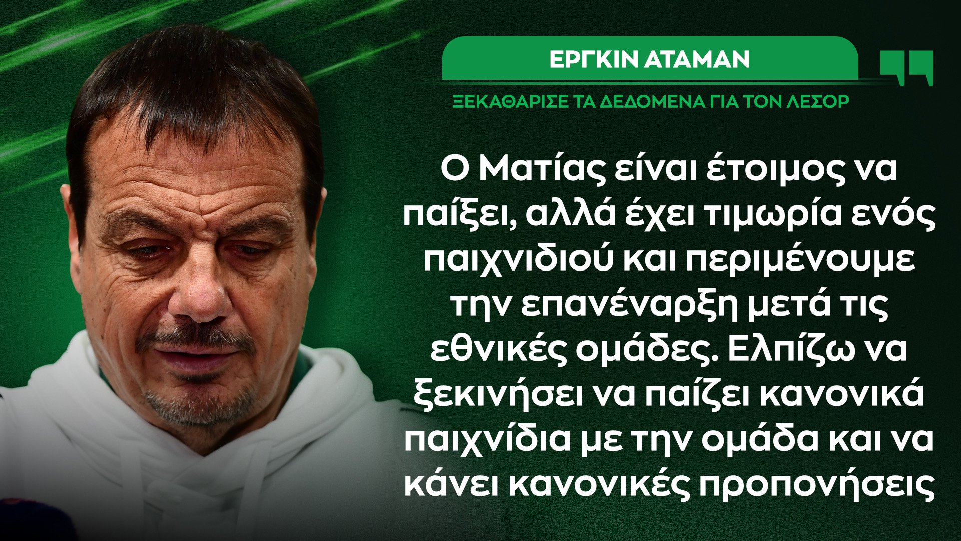 Φυσικά, αυτή η αισιοδοξία οφείλεται – και - στην επικείμενη επιστροφή του Ματίας Λεσόρ. Ο Τούρκος τεχνικός την παραμονή του αγώνα με την Παρί ξεκαθάρισε πως ο κορυφαίος σέντερ της Ευρώπης είναι έτοιμος να επιστρέψει σε κανονικούς ρυθμούς μετά τη διακοπή για τα «παράθυρα». Ο Λεσόρ «κουβαλάει» την τιμωρία από τον τσακωμό με τον Ουέιντ Μπόλντγουϊν και δεν θα βρίσκεται στη διάθεση του Αταμάν απέναντι στην Παρί. Όμως, στο «τριφύλλι» θεωρούν πως ο έμπειρος ψηλός θα τεθεί σύντομα στις... υπηρεσίες του προπονητή του.