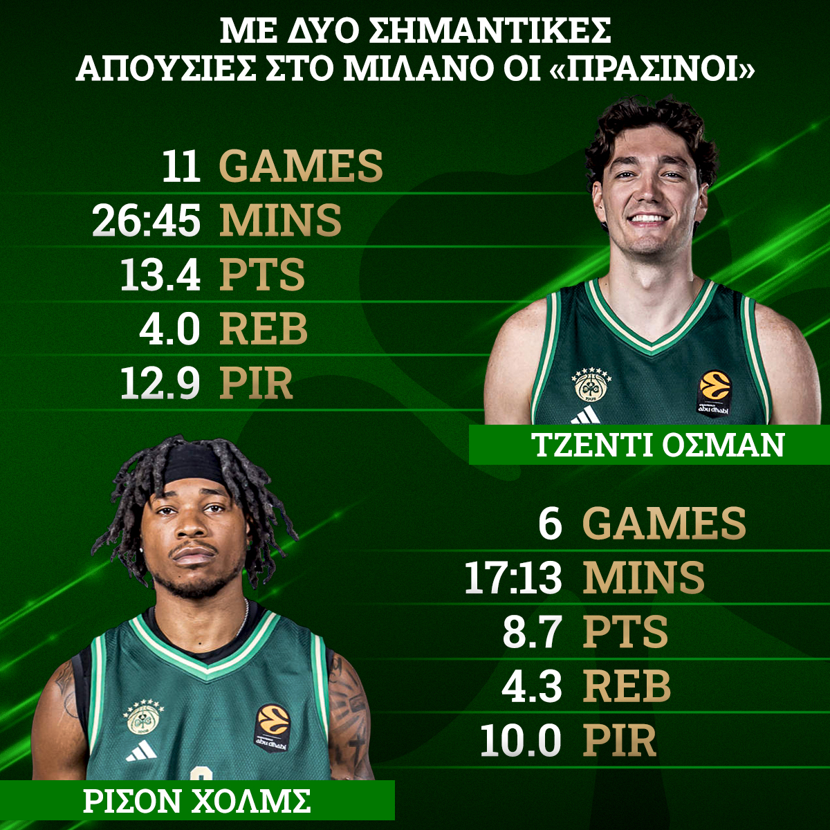 Ο κόουτς Αταμάν επιβεβαίωσε κατά την αναχώρηση για το Μιλάνο πως οι «πράσινοι» δεν θα έχουν στη διάθεσή τους το δίδυμο Τζέντι Όσμαν και Ρισόν Χολμς. Με άλλα λόγια, για ακόμα ένα παιχνίδι ο Παναθηναϊκός AKTOR θα βασιστεί αρκετά στο σχήμα με τρεις γκαρντ, ενώ παράλληλα θα περιμένει μια νέα «γεμάτη» εμφάνιση του Κένεθ Φαρίντ.