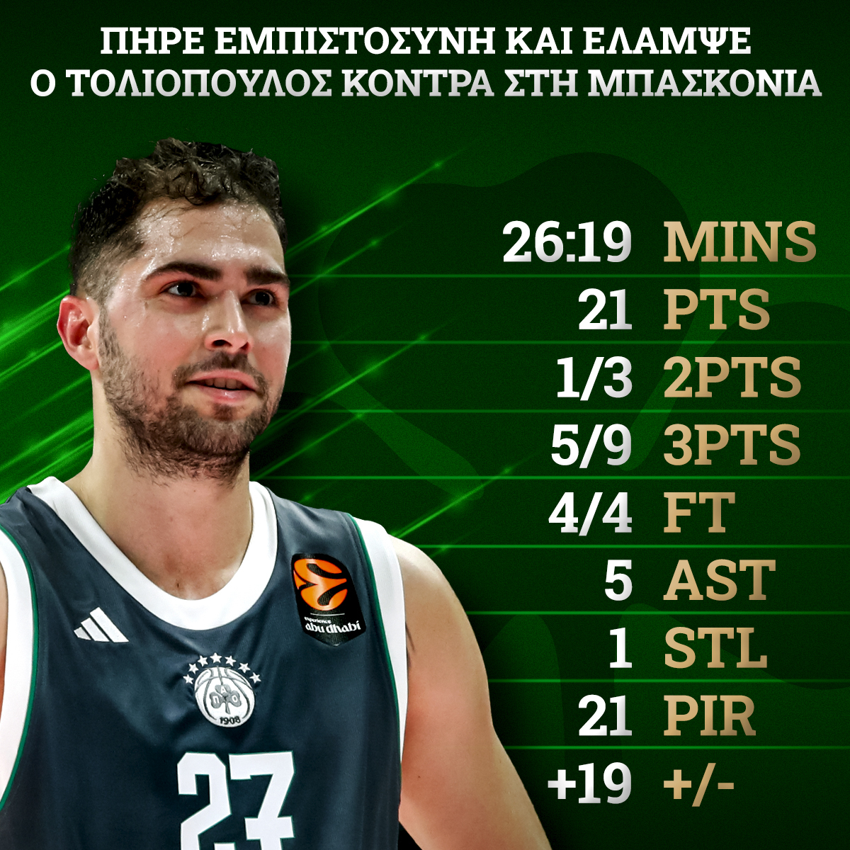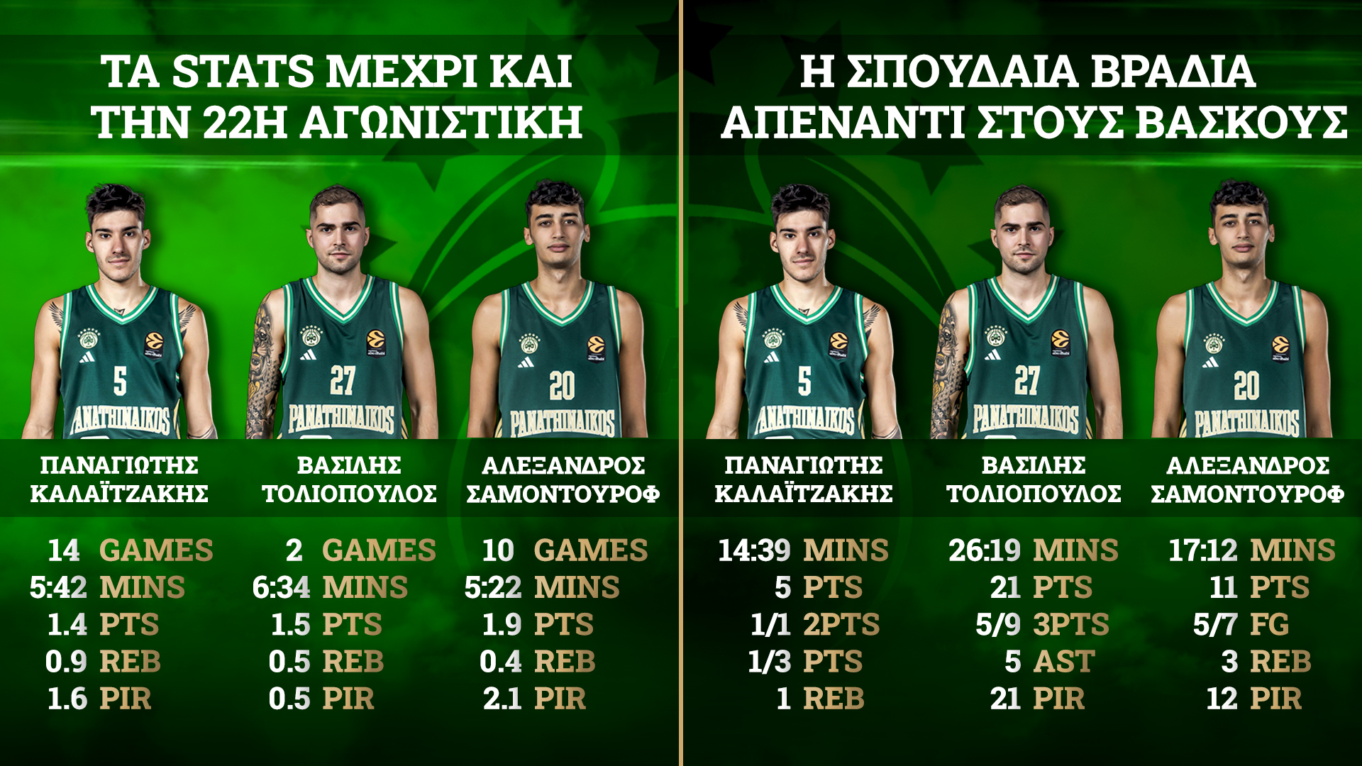 Παράλληλα, δίπλα στον 30χρονο σκόρερ, σημαντικό step up έκαναν και οι Αλέξανδρος Σαμοντούροφ - Παναγιώτης Καλαϊτζάκης. Αμφότεροι απέδειξαν -εκ νέου- πως μπορούν να βοηθούν στο «πράσινο» ροτέισιον και να δίνουν πολύτιμες «ανάσες» στο δίδυμο Τζέντι Όσμαν - Χουάντσο Ερνανγκόμεθ. Φυσικά, η Μπασκόνια δεν είναι ένας αντίπαλος που προσφέρεται για ασφαλή συμπεράσματα, όμως η διάθεση του «τριφυλλιού» ήταν στο επίπεδο που όφειλε να είναι.