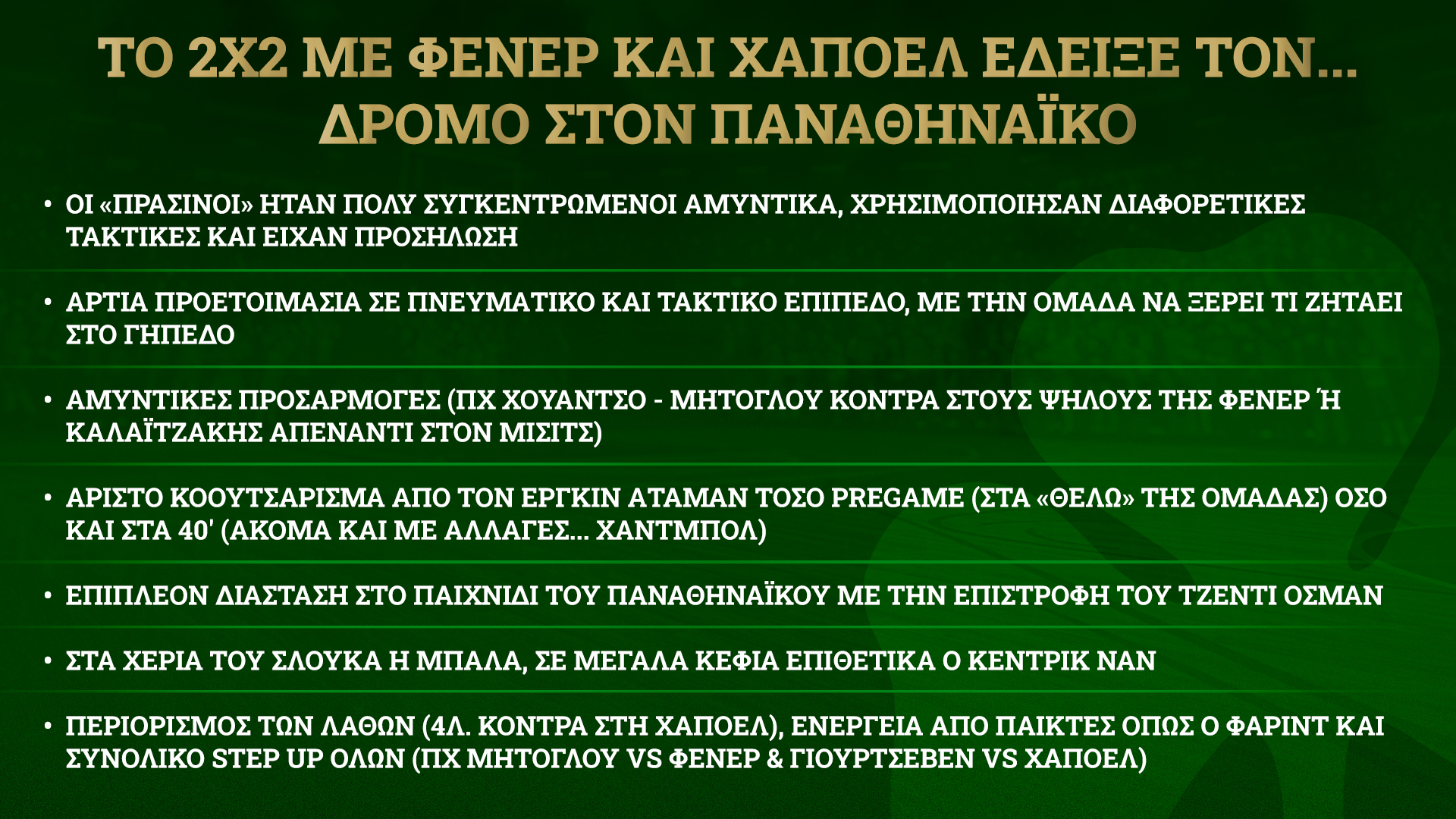 Σε κάθε περίπτωση, οι νίκες απέναντι σε «Φενέρ» και Χάποελ αποτελούν... οδηγό για το «τριφύλλι». Η ομάδα του Εργκίν Αταμάν ήταν άρτια προετοιμασμένη σε τακτικό και πνευματικό επίπεδο, ανέβασε το επίπεδο της αμυντικής της προσήλωσης, άφησε τη μπάλα στα χέρια του Κώστα Σλούκα και είδε τον Κέντρικ Ναν να πετάει... φωτιές. Παράλληλα, οι «πράσινοι» περιόρισαν τα λάθη τους, μετρώντας μόλις 4λ. κόντρα στους Ισραηλινούς.