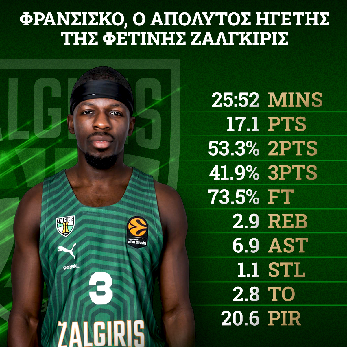 Φυσικά, μιλώντας για την επίθεση του Μασιούλις, ειδική μνεία πρέπει να γίνει στον Σιλβέν Φρανσίσκο, τον παίκτη που ετοιμάζεται να βγει στην αγορά το 2026 και να βρει συμβόλαιο άνω των 2 εκατ. ευρώ ετησίως. Το άλλοτε «πουλέν» του Βασίλη Σπανούλη στο Περιστέρι κάνει breakout season στην EuroLeague, μετρώντας 17,1 πόντους, 2,9 ριμπάουντ και 6,9 ασίστ κατά μέσο όρο.