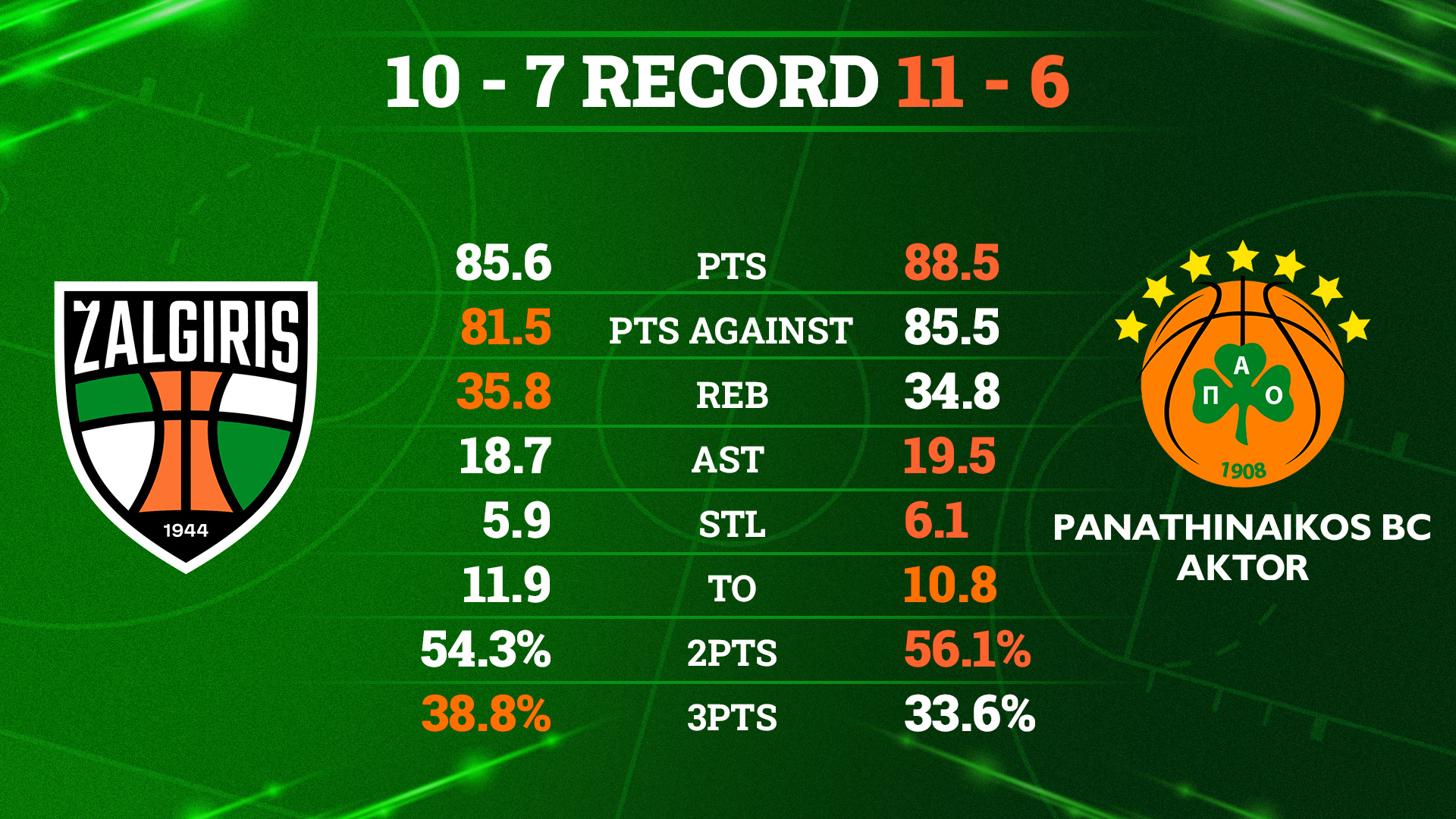 Σε γενικές γραμμές, η ομάδα από το Κάουνας δεν διανύει την καλύτερή της περίοδο, όμως απέχει μια νίκη από το «τριφύλλι» (10-7 ρεκόρ), χάρη στο εξαιρετικό ξεκίνημα που έκανε στη σεζόν. Θα πρέπει, πάντως, να τονίσουμε πως η Ζαλγκίρις έχει δύο ήττες στα τρία πιο πρόσφατα εντός έδρας παιχνίδια της (Μακάμπι Τελ Αβίβ και Εφές).