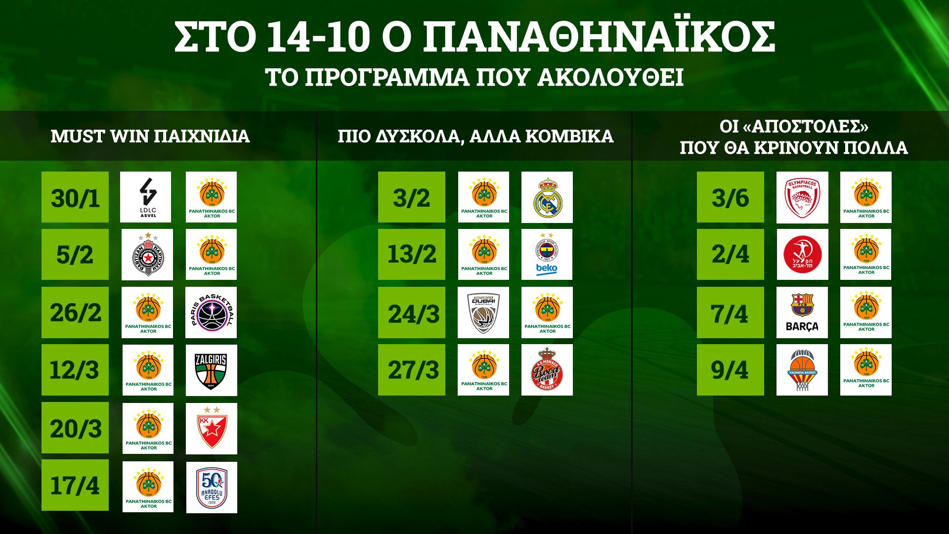 Σε κάθε περίπτωση, ο Παναθηναϊκός AKTOR μπαίνει σε μια εποχή με... μαζεμένα must wins και το παιχνίδι επί γαλλικού εδάφους είναι ένα τέτοιο. Άλλωστε, το σύνολο του Αταμάν θα αναμετρηθεί με τους ουραγούς της EuroLeague.