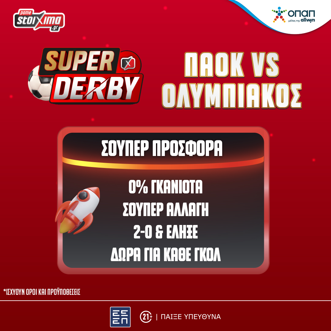 Στο Pamestoixima.gr ζεις το μεγάλο ντέρμπι της Super League με μοναδικές προσφορές, έπαθλα και περισσότερες από 800 στοιχηματικές επιλογές για να απολαύσεις τη δράση στο έπακρο!