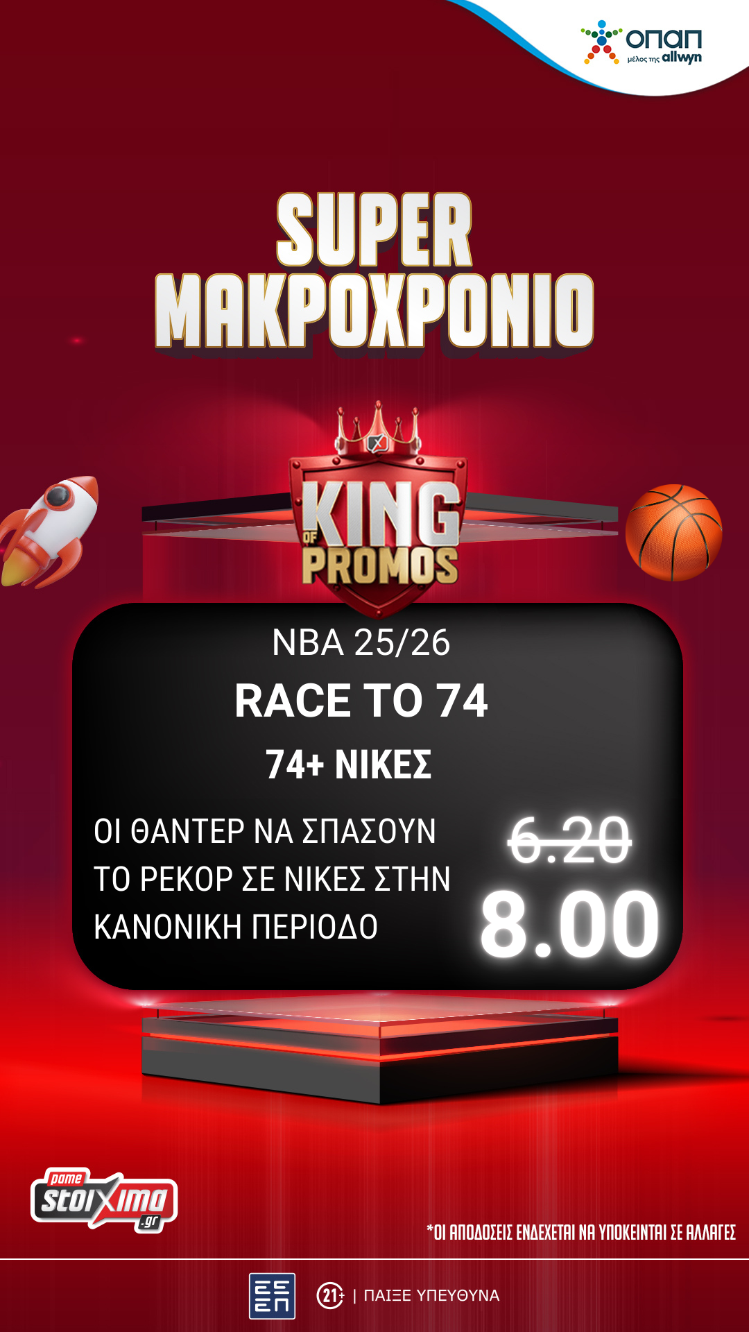 Για τη νέα σεζόν 2025/26, το Pamestoixima.gr προσφέρει την σούπερ ενισχυμένη απόδοση σχετικά με το αν οι Οκλαχόμα Σίτι Θάντερ μπορούν να φτάσουν τις 74+ νίκες στη regular season, ξεπερνώντας κάθε προηγούμενο ρεκόρ!