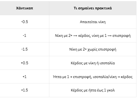 Η λογική του χάντικαπ είναι απλή. Όταν μια ομάδα έχει αρνητικό χάντικαπ (-), χρειάζεται να κερδίσει με μεγαλύτερη διαφορά για να επαληθευτεί το στοίχημα. Αντίθετα, μια ομάδα με θετικό χάντικαπ (+) μπορεί να θεωρηθεί κερδισμένη ακόμη και αν φέρει ισοπαλία ή ηττηθεί με μικρή διαφορά.